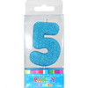CAKE CANDLE NUMBER 5 GLITTER BLUE. - Size: approx. 9cm high including stick.